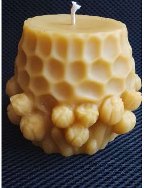 Handmade natural beeswax cylindrical candle with honeycomb texture, wrapped at the base with...